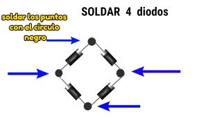 Para montar un puente rectificador recurrimos a 4 diodos rectificadores, es importante elegir los amperios que vamos a usar , los más comunes son el 1N4007 de 1 Amperio si queremos de de 3 amp. o 6 cualquier otro valor el procedimiento de conexión es el mismo