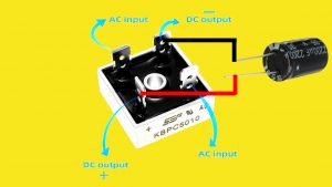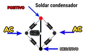 Una vez soldado el condensador solamente nos queda conectar las entradas de la corriente alterna AC a la salida de un transformador
