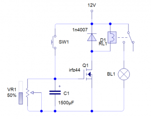 El circuito tiene un voltaje de 12v que pasa atreves de la bobina y llega asta el terminal de mosfet, cuando pulsamos el pulsador SW1 se carga el C1 y activa el mosfet activando el relé y encendiendo la lampara led, el condensador se ira descargando atreves del potenciómetro, cuando el C1 baja el voltaje el mosfet deja de conducir y por consiguiente el relé se desconecta, con el potenciómetro ajustaremos el tiempo de descarga del condensador